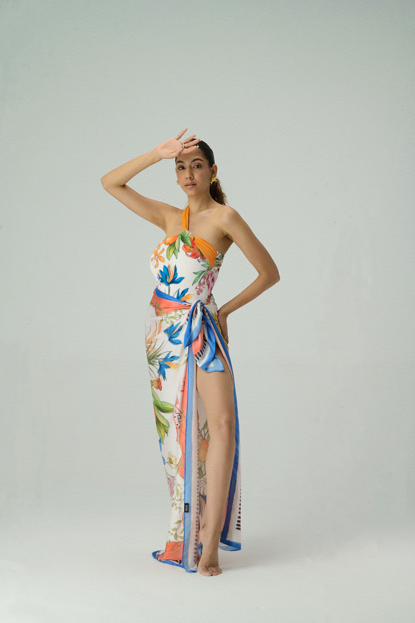 SWIMSUIT- Shell: Italian Regenerated Jersey, Lining: Starlight, SARONG- Chiffon satin