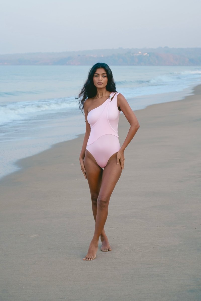 This one-shoulder swimsuit blends clean design with subtle detail, featuring a sleek silhouette and refined silver trim. It offers optimal coverage and a smooth, comfortable fit.