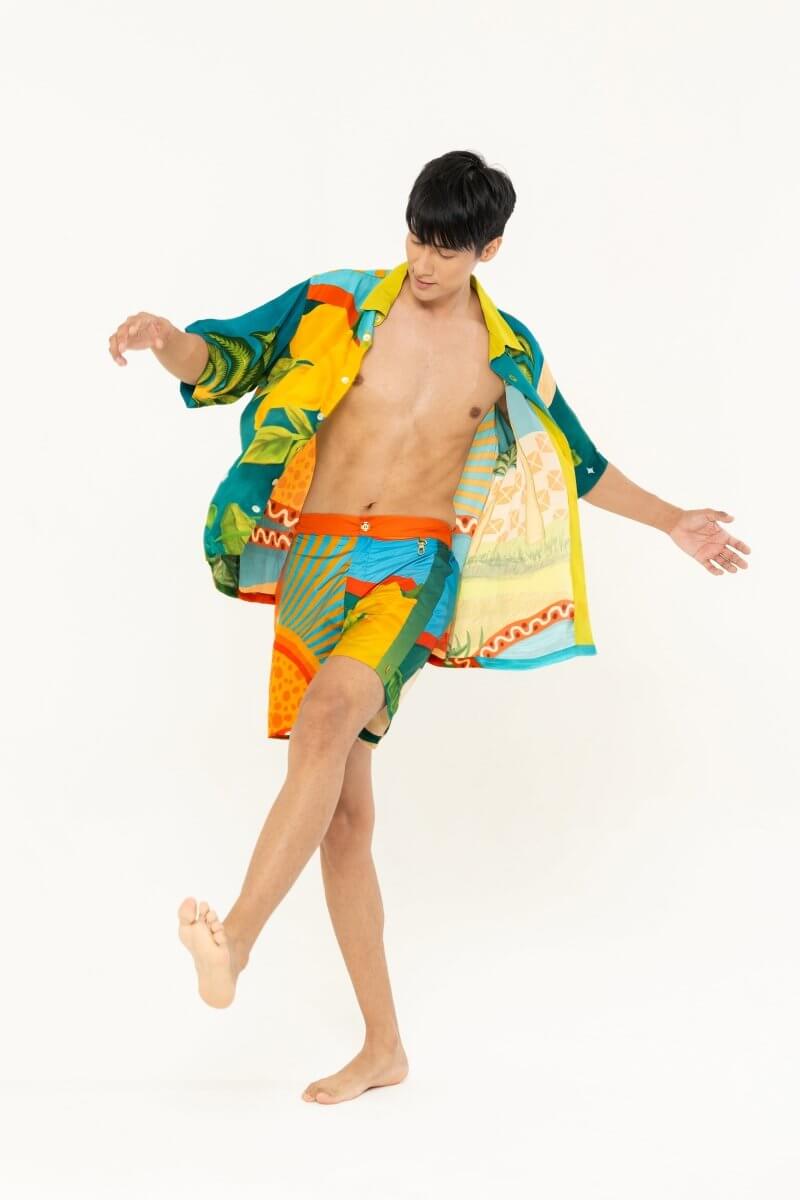 • Comfort fit long swim shorts in Abandoned Odyssey print in a parachute sheeter fabric with an attached lining.